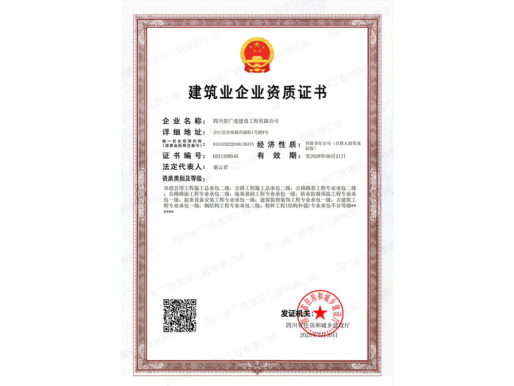 目前,公司建筑工程施工總承包資質(zhì)已升級(jí)為壹級(jí)資質(zhì),公司有職工280余人,有職稱人員113人(其中高級(jí)職稱3人、中級(jí)職稱32人、初級(jí)職稱78人);各類管理上崗人員40余人;大中專學(xué)歷85余人;高中專學(xué)歷120余人。企業(yè)法人代表兼總經(jīng)理:謝云君,注冊(cè)資金壹億伍仟萬(wàn)元,下面設(shè)有一個(gè)分公司“四川省廣進(jìn)建設(shè)工程有限公司赤水分公司”,分公司地址:貴州省遵義市赤水市太平街。